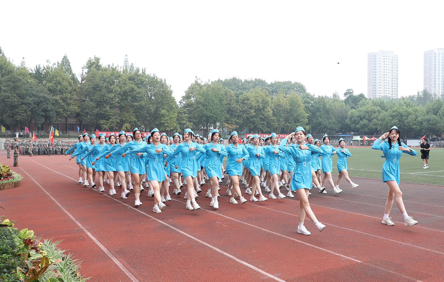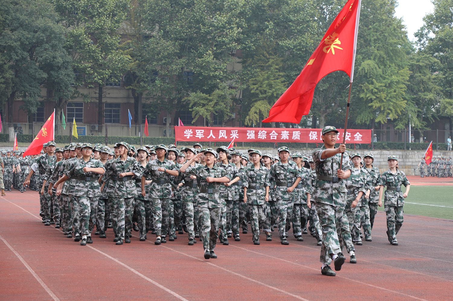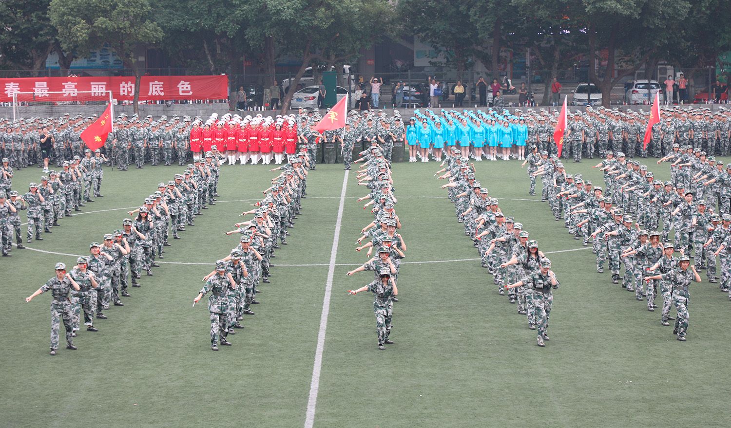 指挥员下达命令后,分列式正式开始,各方阵依次通过主席台。随后,军体拳、格斗术和匕首操等军训特色科目展示依次登场。