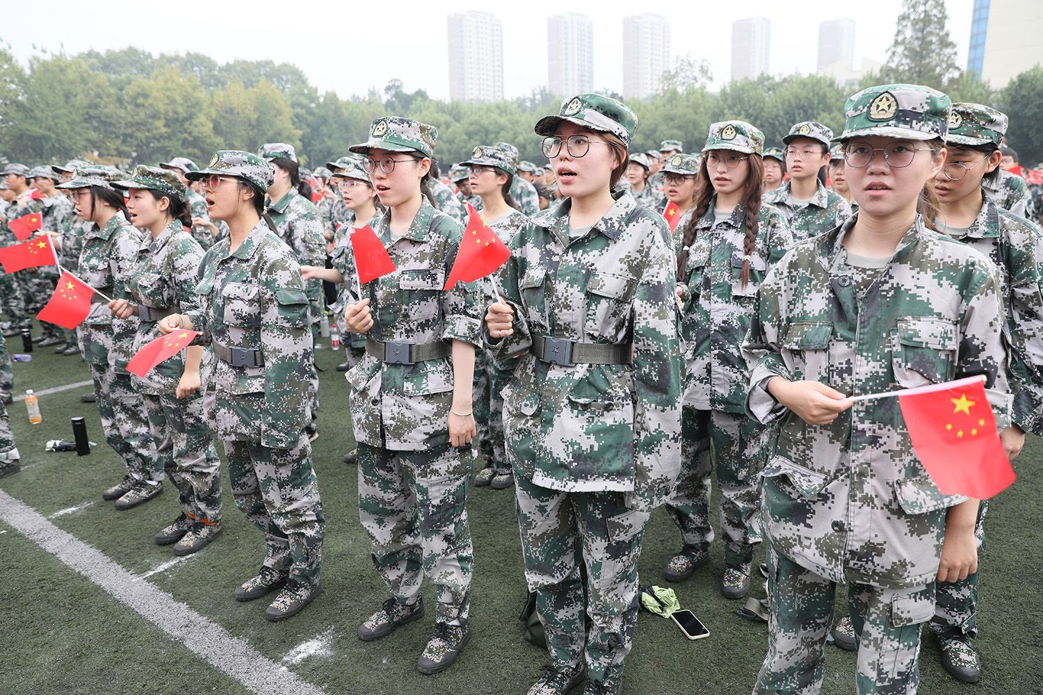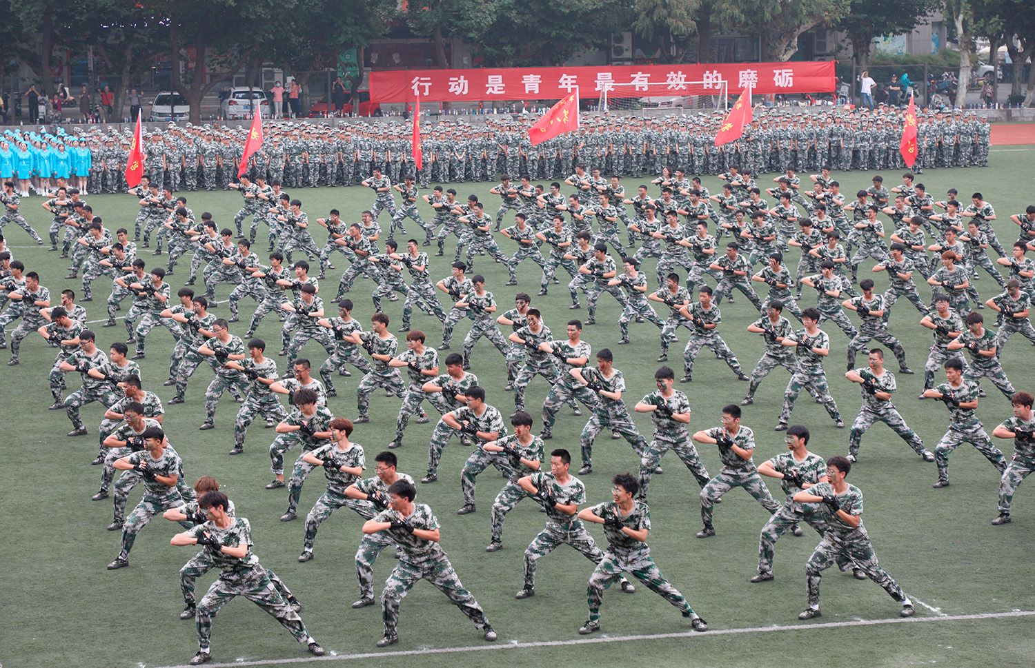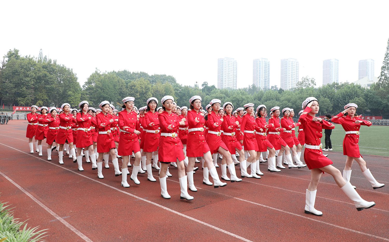 指挥员下达命令后,分列式正式开始,各方阵依次通过主席台。随后,军体拳、格斗术和匕首操等军训特色科目展示依次登场。