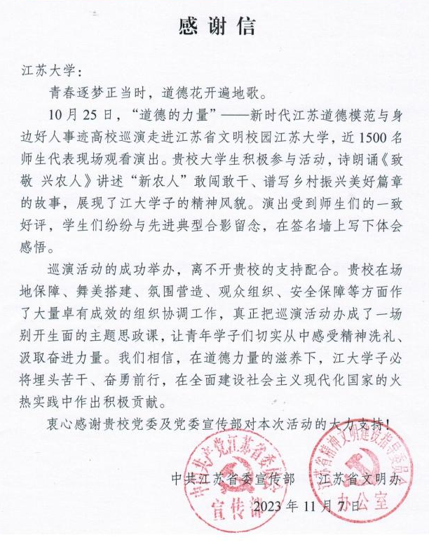 近日,江苏省委宣传部、省文明办向我校发来感谢信,对我校在“道德的力量”——新时代江苏道德模范与身边好人事迹巡演走进开云电子入口_开云(中国)中所做工作提出高度赞扬,对我校为全省精神文明建设作出的重要贡献表示衷心感谢。