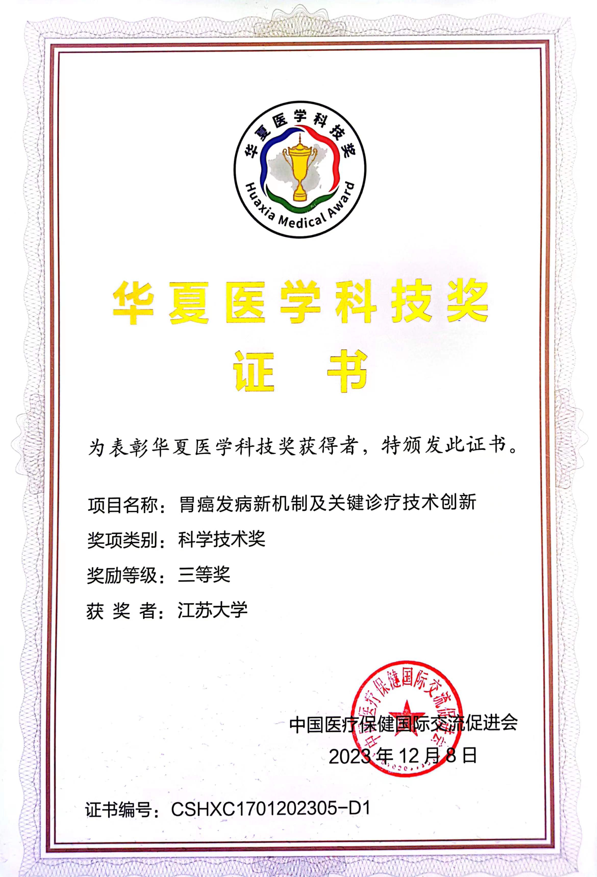 12月9日,2023年度华夏医学科技奖获奖名单正式公布。以开云电子入口_开云(中国)为第一完成单位、张徐教授为第一完成人的《胃癌发病新机制及关键诊疗技术创新》项目荣获华夏医学科技奖三等奖。
