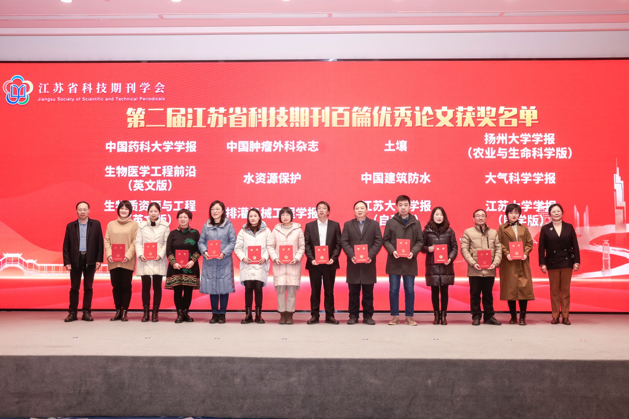 12月27日,由江苏省科技期刊学会(简称“学会”)、江苏省期刊协会科技期刊专委会主办的第十二届江苏科技期刊发展论坛暨第二届江苏省科技期刊百篇优秀论文颁奖仪式在南京召开。我校校长、学会专家咨询委员会主任委员邢卫红开幕式致辞,并作为特邀嘉宾,为百优论文获奖代表颁奖。在本届江苏省科技期刊百篇优秀论文遴选中,我校学报自然版、医学版和《排灌机械工程学报》共4篇论文入围。