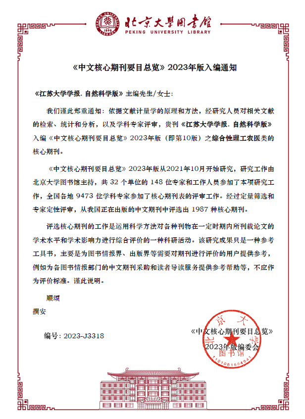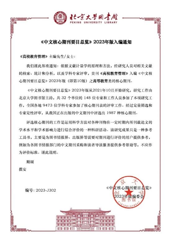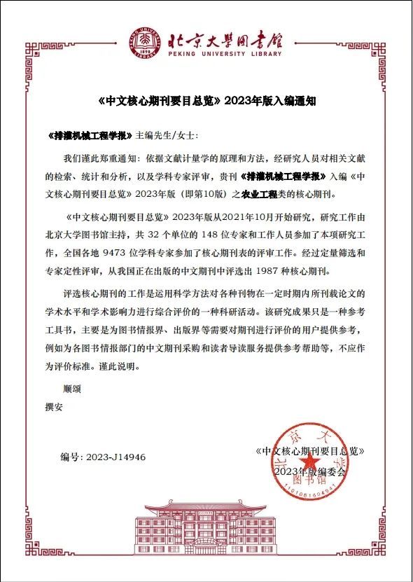 近日,在北京大学图书馆《中文核心期刊要目总览》2023年版(第10版)遴选中,我校主办的《开云电子入口_开云(中国)学报(自然科学版)》第8次入选,入编综合性理工农医类核心期刊;《排灌机械工程学报》第7次入选,入编农业工程类核心期刊;《高校教育管理》第4次入选,入编高等教育类核心期刊。
