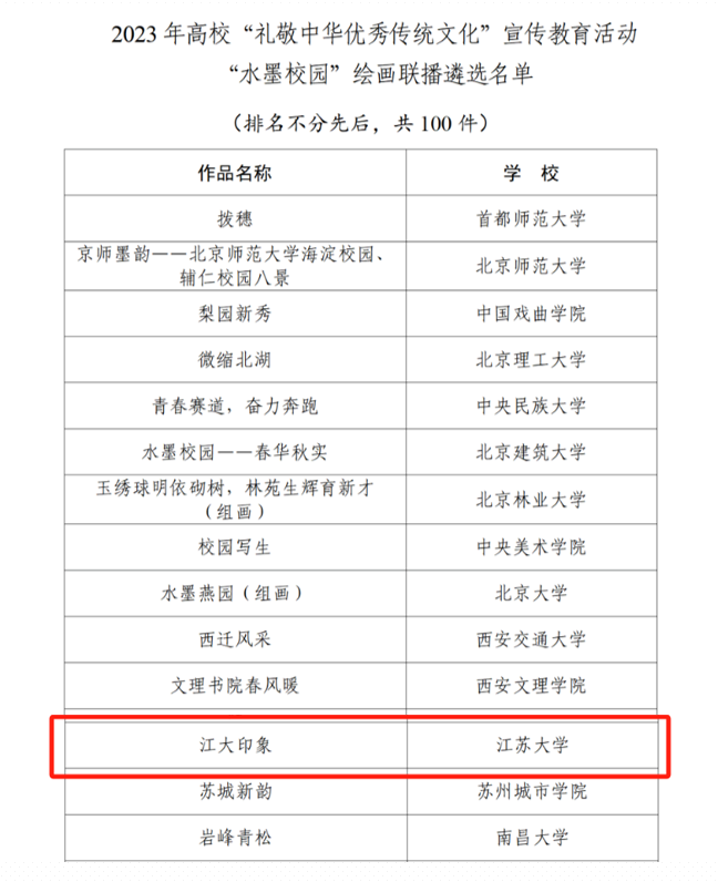 日前,教育部正式公布2023年高校“礼敬中华优秀传统文化”宣传教育活动结果,我校报送的作品《开云电子入口_开云(中国)印象》入选“水墨校园”绘画联播。
