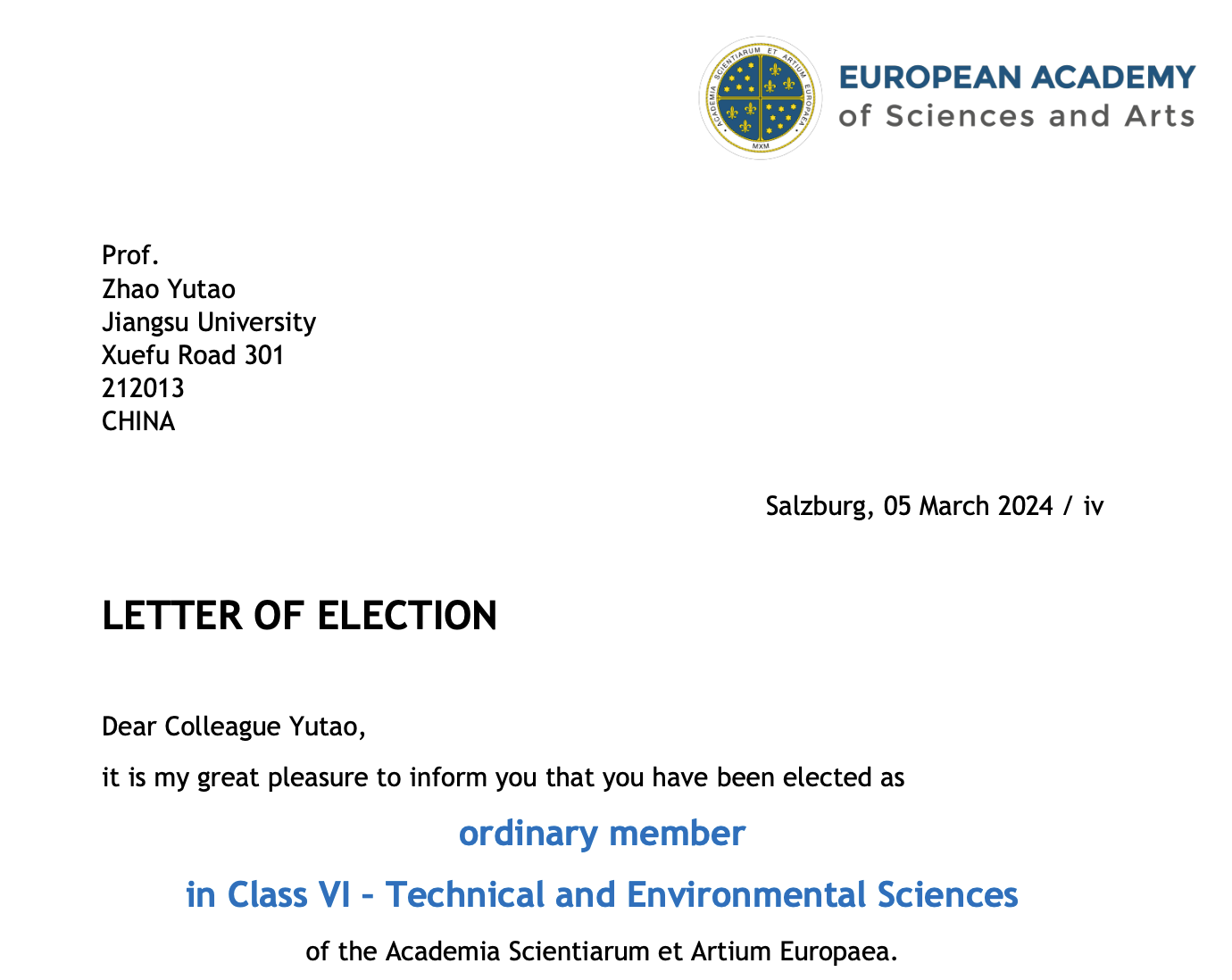 近日,欧洲科学与艺术院(European Academy of Sciences and Arts)院长Prof. Klaus Mainzer发来贺信:经理事会投票,开云电子入口_开云(中国)材料科学与工程学院赵玉涛教授当选欧洲科学与艺术院院士(技术与环境科学学部)。