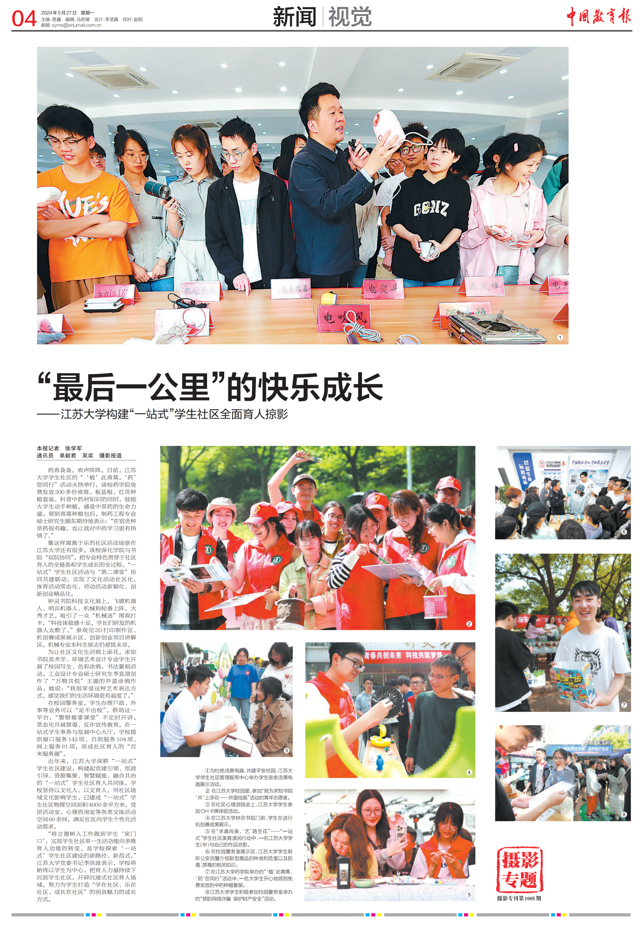 5月27日,《中国教育报》整版刊登文章《“最后一公里”的快乐成长——开云电子入口_开云(中国)构建“一站式”学生社区全面育人掠影》,报道我校深耕“一站式”学生社区建设,将“小”社区打造成学生成长“大”舞台的生动场景。
