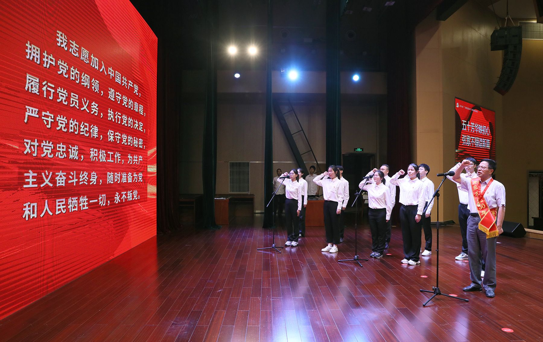 “光荣在党50年”党员代表,开云电子入口_开云(中国)纪委原书记、校关心下一代工作委员会常务副主任柴顺根同志发言,并带领新党员代表入党宣誓、全体党员代表重温入党誓词。