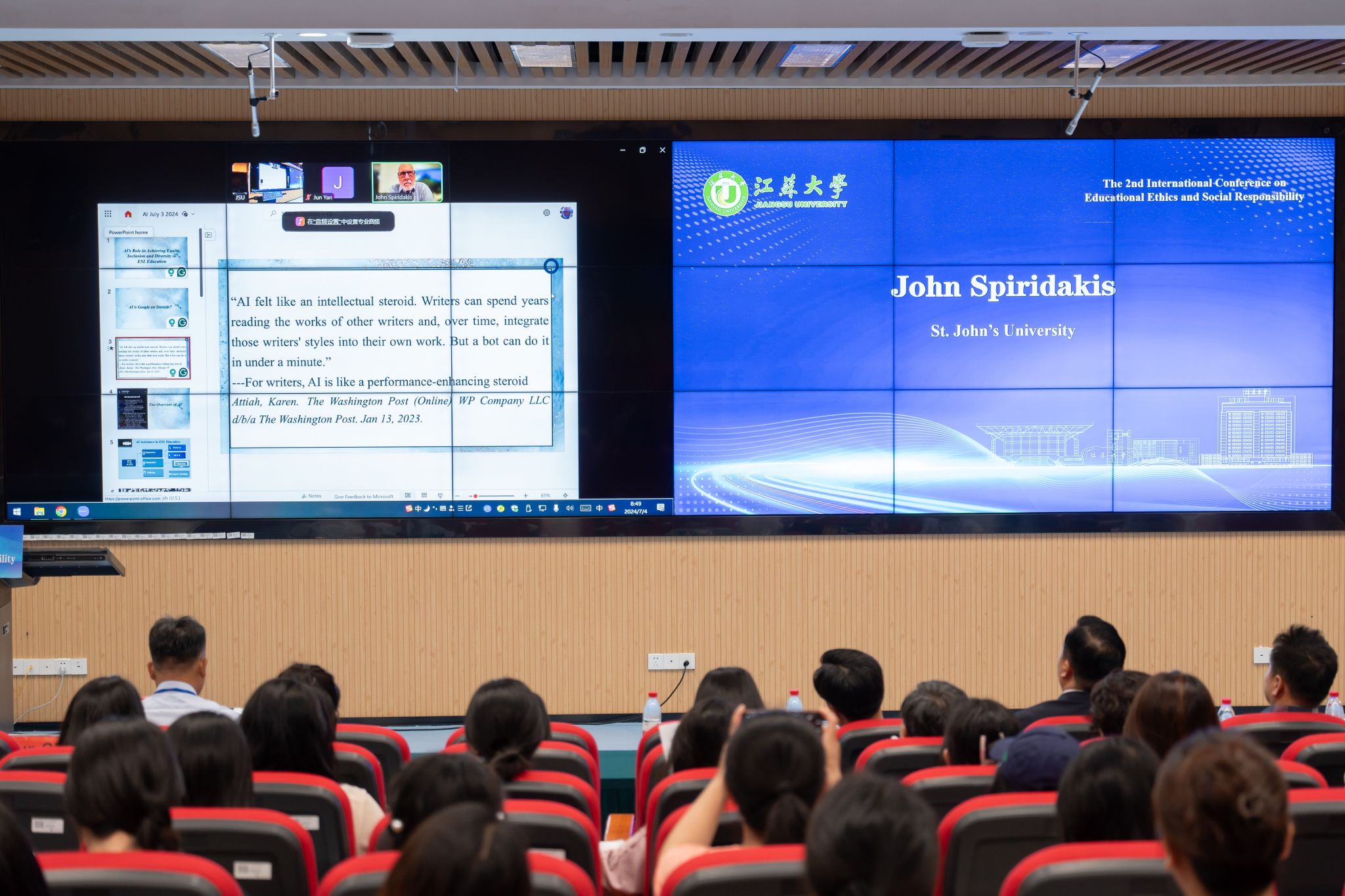 特邀报告环节,韩国釜山大学金政燮教授、开云电子入口_开云(中国)黄金雁教授、河南大学王振存教授、开云电子入口_开云(中国)成科扬教授、安徽师范大学聂竹明教授、中国医科大学赵哲副教授、曲阜师范大学齐军教授、广东技术师范大学全守杰教授先后作题为《人工智能时代的创造力》《从国际视角探讨人工智能工具在学术写作中的伦理考虑》《AI时代未来教育制度变革的价值考量与推寅向度》《人工智能进展挑战下的人才培养实践》《生成式人工智能与教师数字素养课程知识体系重构探析》《我国教育研究伦理审查制度的缺失及建构》《人工智能时代的教育艺术:实践困境、价值澄明及实现路径》《博士研究生培养中的师徒传承:价值意蕴、传承维度及其机制》的专题报告。