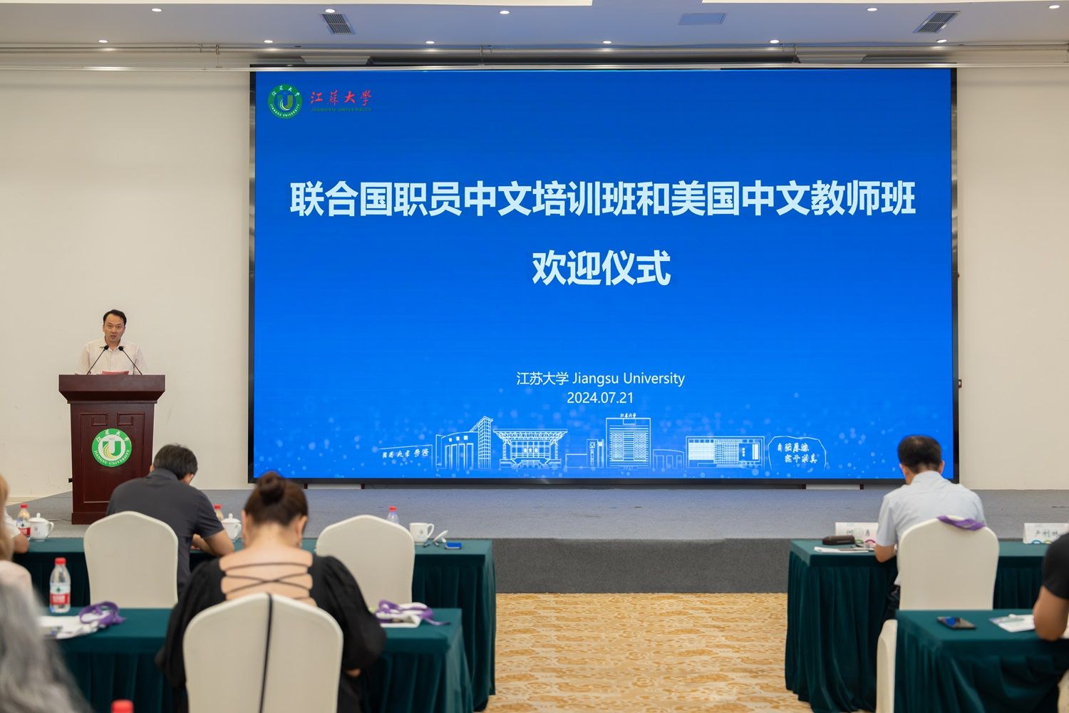 联合国语言部中文组原组长、联合国赴华培训项目负责人何勇,校党委常委、副校长任旭东,镇江市外事办公室主任卢利林,我校党委统战部、国际合作与交流处、海外教育学院、文学院及南京大学海外教育学院相关负责人出席活动。