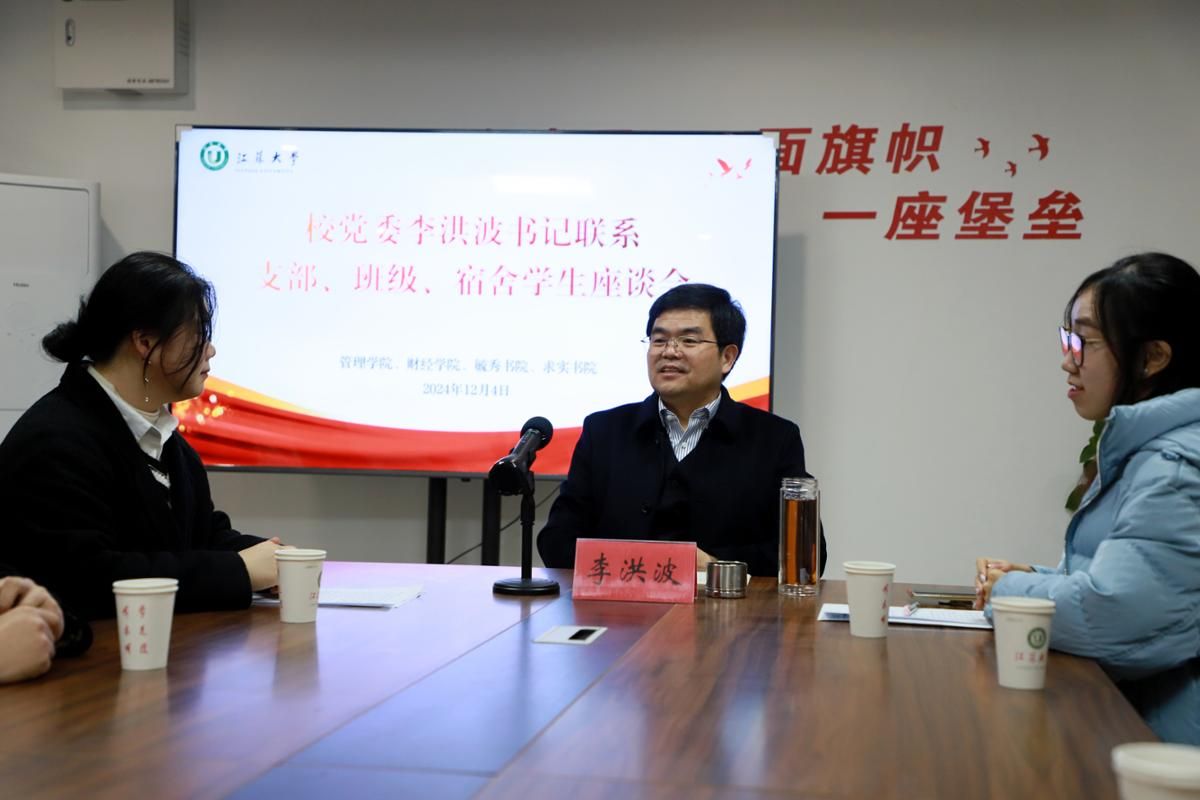12月4日,校党委书记李洪波走进毓秀书院、求实书院,与所联系的管理学院本科生工商支部、物流2202班、财经学院寝室的同学交流座谈,指导学生的学习与成长。