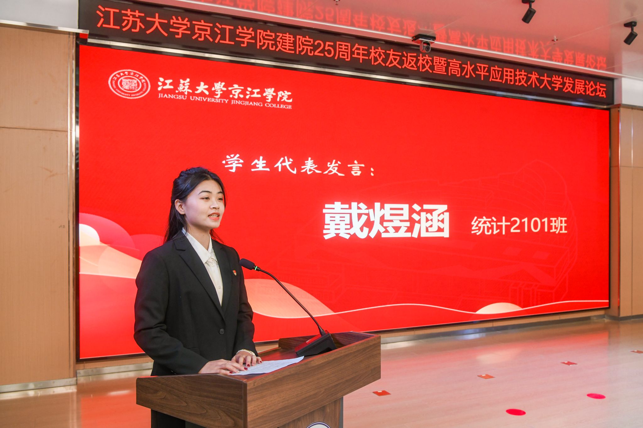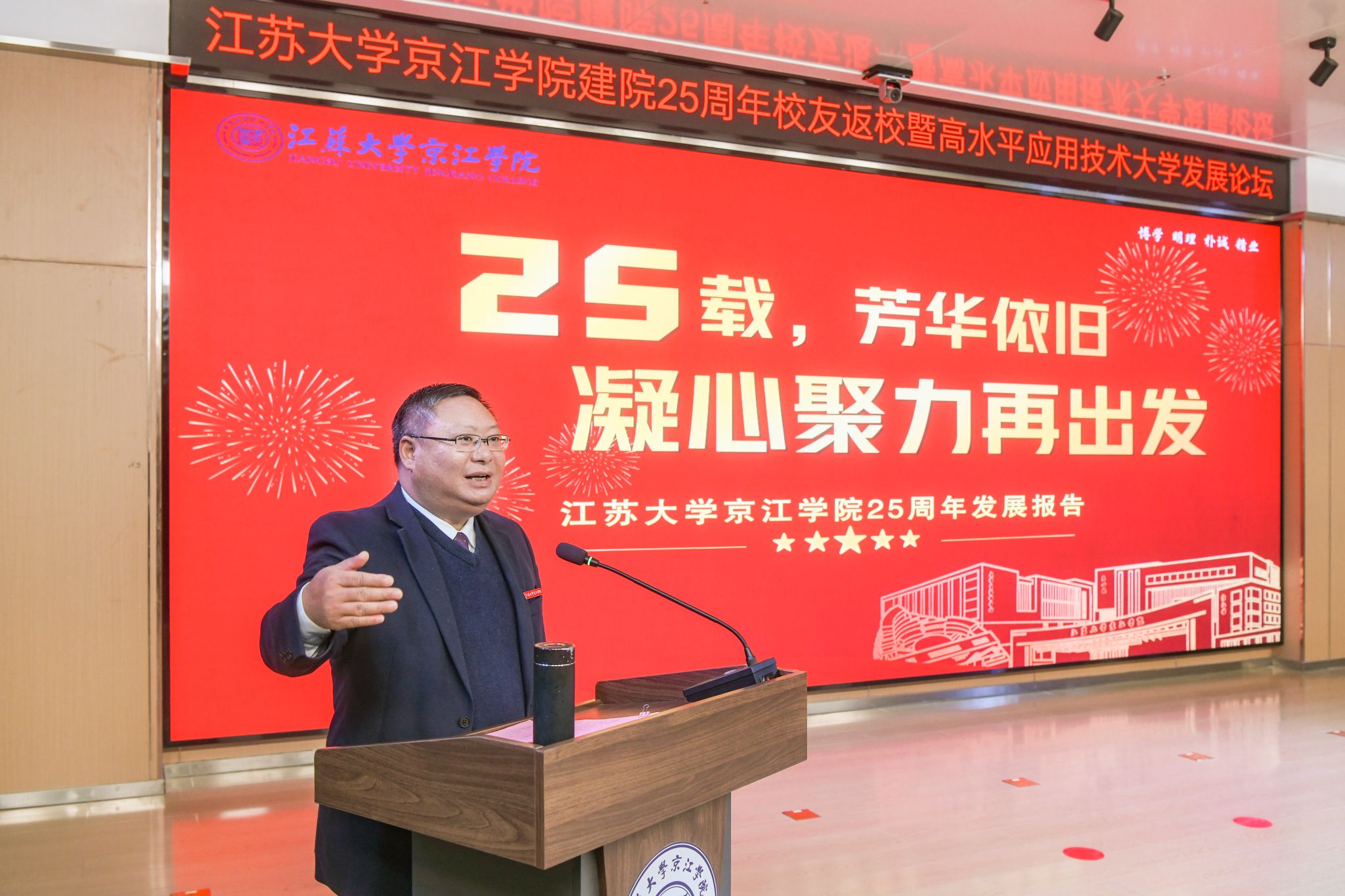 12月21日,京江学院在学术交流中心报告厅举行建院25周年校友返校暨高水平应用技术大学发展论坛。镇江市政协副主席、开云电子入口_开云(中国)副校长陈红,镇江市发展和改革委员会副主任朱华,南京师范大学中北学院院长戴传超,校友会与对外联络办公室主任李国昊,企业代表,京江学院全体院领导、校友代表、教师代表、学生代表出席大会。