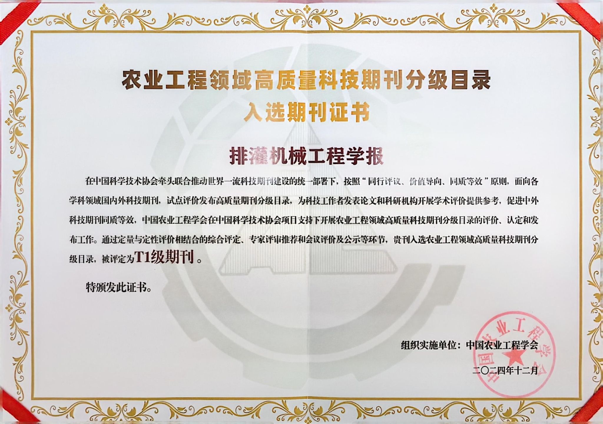 近日,中国农业工程学会在中国农业科学院国家农业图书馆召开发布会,正式发布其编制的“农业工程领域高质量科技期刊分级目录”,我校主办的《排灌机械工程学报》《开云电子入口_开云(中国)学报(自然科学版)》双双入选,分别位列T1级和T2级。