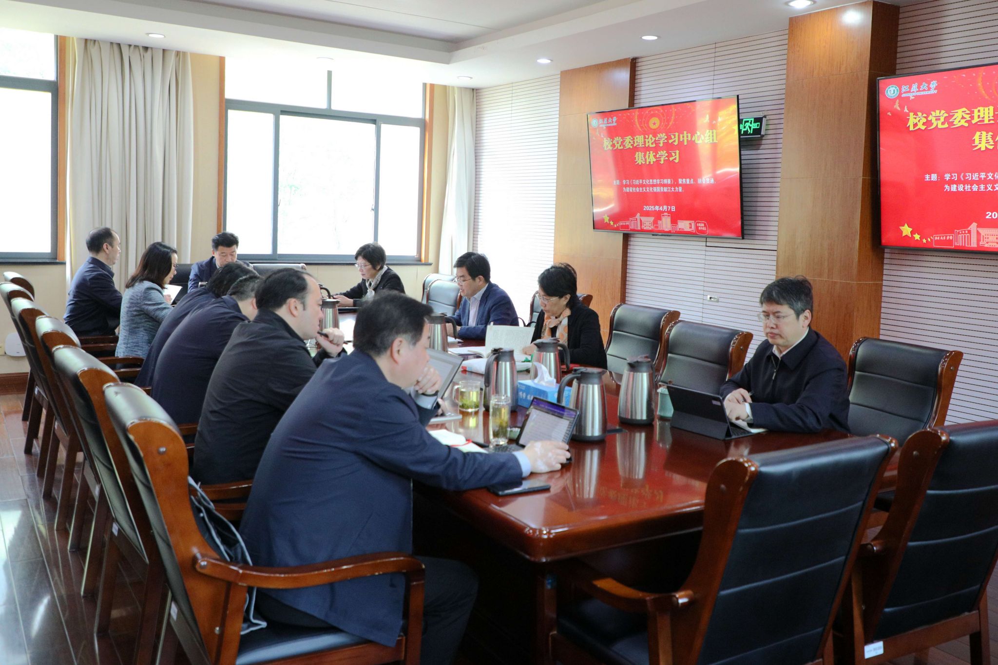 4月7日,校党委理论学习中心组在行政一号楼201会议室专题学习《习近平文化思想学习纲要》。在校校党委理论学习中心组成员参加学习,集体学习由校党委书记李洪波主持。