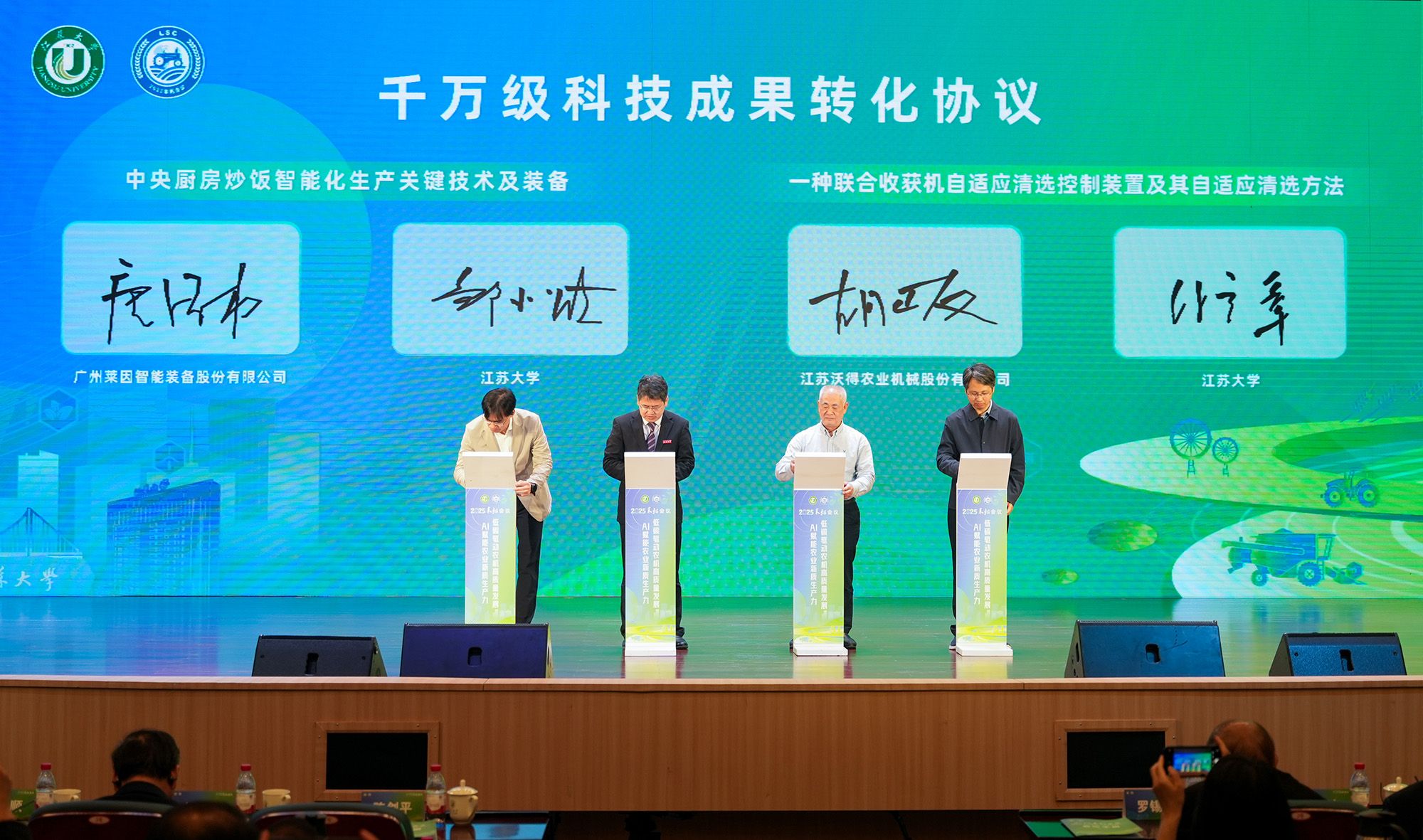 开幕式上,2项千万级农业装备成果签约转让。副校长邹小波与广州莱因智能装备股份有限公司董事长唐德权签署风味量化及自动分装系统成果转让协议;智能农机装备理论与技术重点实验室党委书记、主任徐立章与江苏沃得农业机械股份有限公司副总经理胡必友签署联合收获机脱粒清选自适应控制系统成果转让协议。