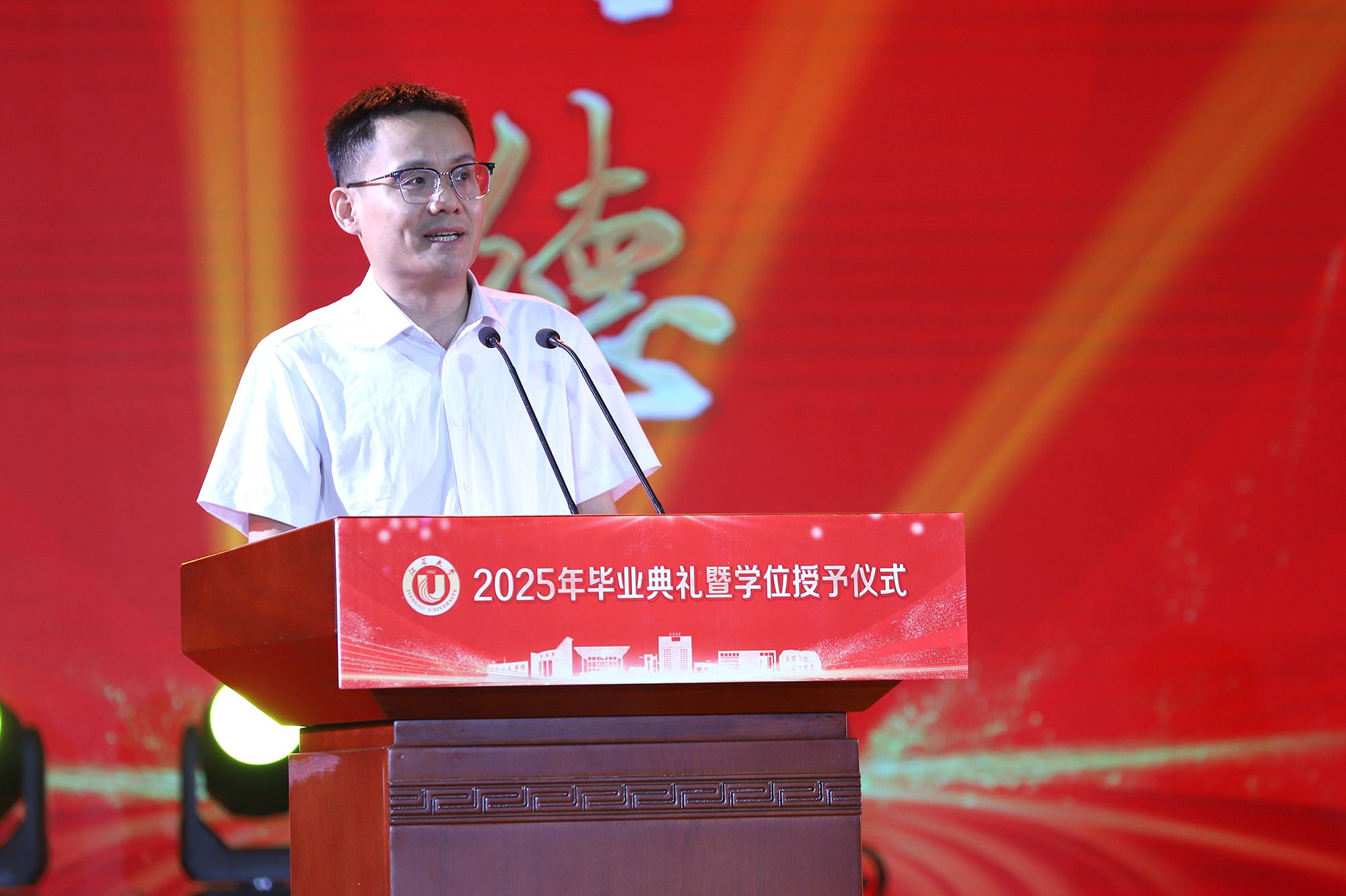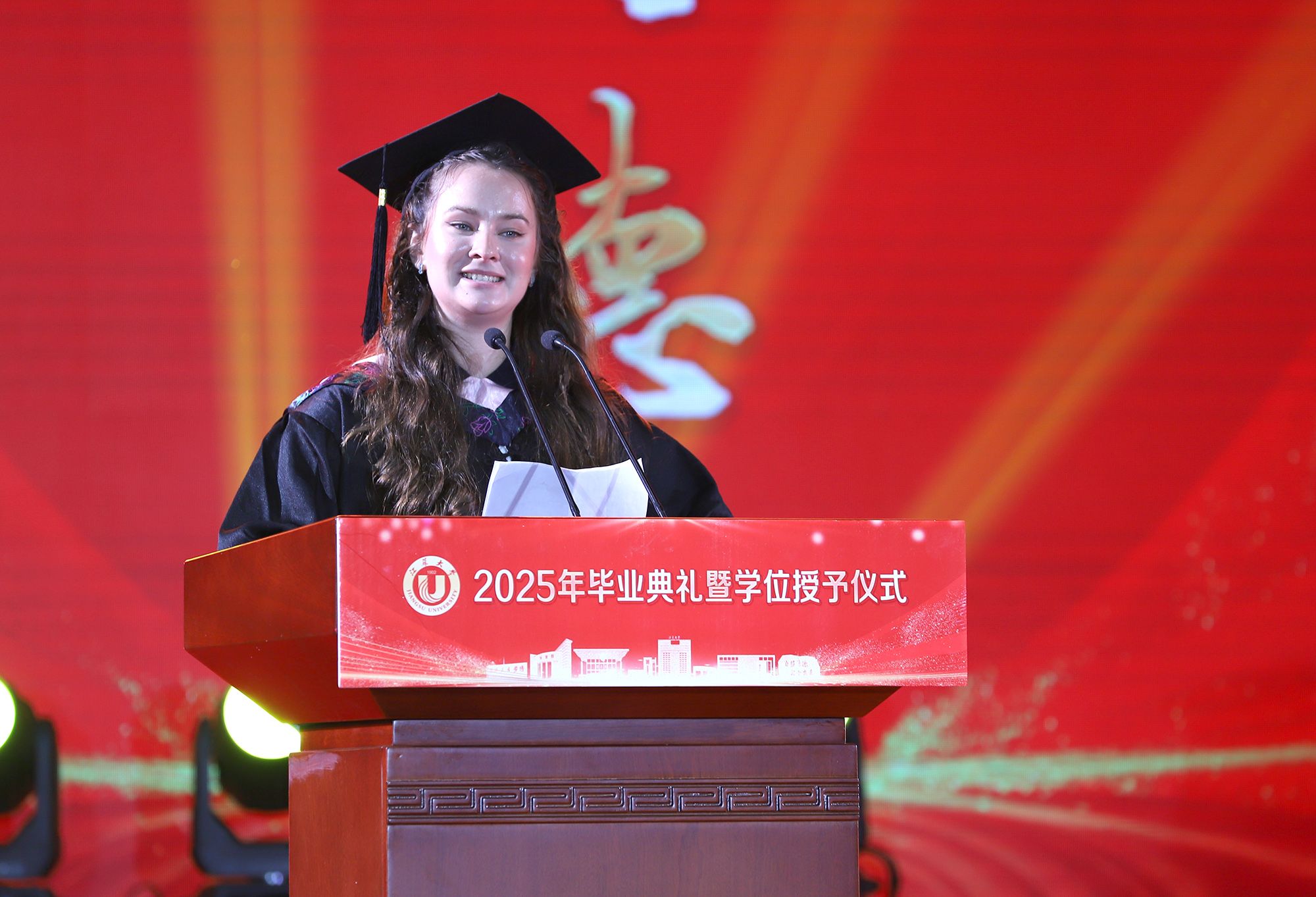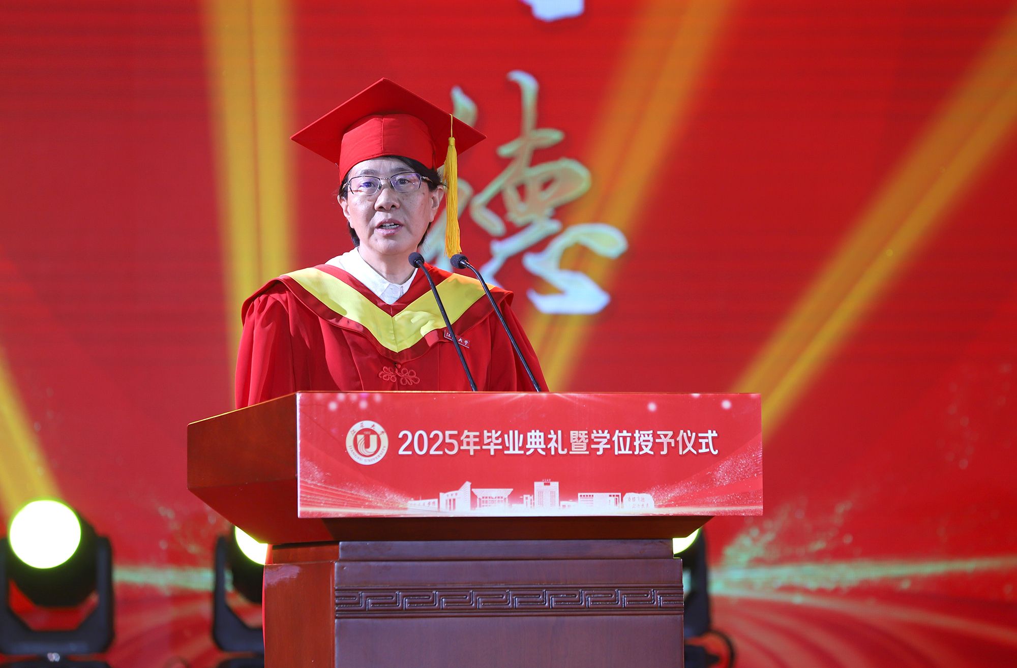 校长邢卫红发表题为《让热爱照见未来》的讲话,代表学校向全体毕业生致以热烈祝贺,向悉心关怀同学的师长、辛勤养育同学的父母以及默默支持大家成长的各界朋友,致以崇高的敬意和衷心的感谢。邢卫红说,大学更深层的意义,在于教会同学们以“热爱”为火种,照亮前路的漫长与未知。这份源自内心的热爱,已化作同学们成长路上的璀璨星光。每一位开云电子入口_开云(中国)学子奋斗的足迹、闪耀的成绩,共同汇聚成开云电子入口_开云(中国)校园最亮眼的青春图谱,照亮前行的每一步。邢卫红说,优秀没有标准答案,每一份热爱都定义着独特的精彩,每一次坚持都谱写着动人的篇章。她希望同学们因热爱而选择,在变革的时代中寻找内心的确定;因热爱而坚持,在平凡的岗位上成就非凡的业绩;因热爱而绽放,在生活的微光中积攒前行的力量。邢卫红希望同学们永远保持对生活的热忱,于细微处感受温暖美好,在热爱中拥抱天地辽阔。她祝愿大家带着开云电子入口_开云(中国)赋予的热爱与力量,勇敢奔赴山海,让热爱之光照见无比璀璨的未来。