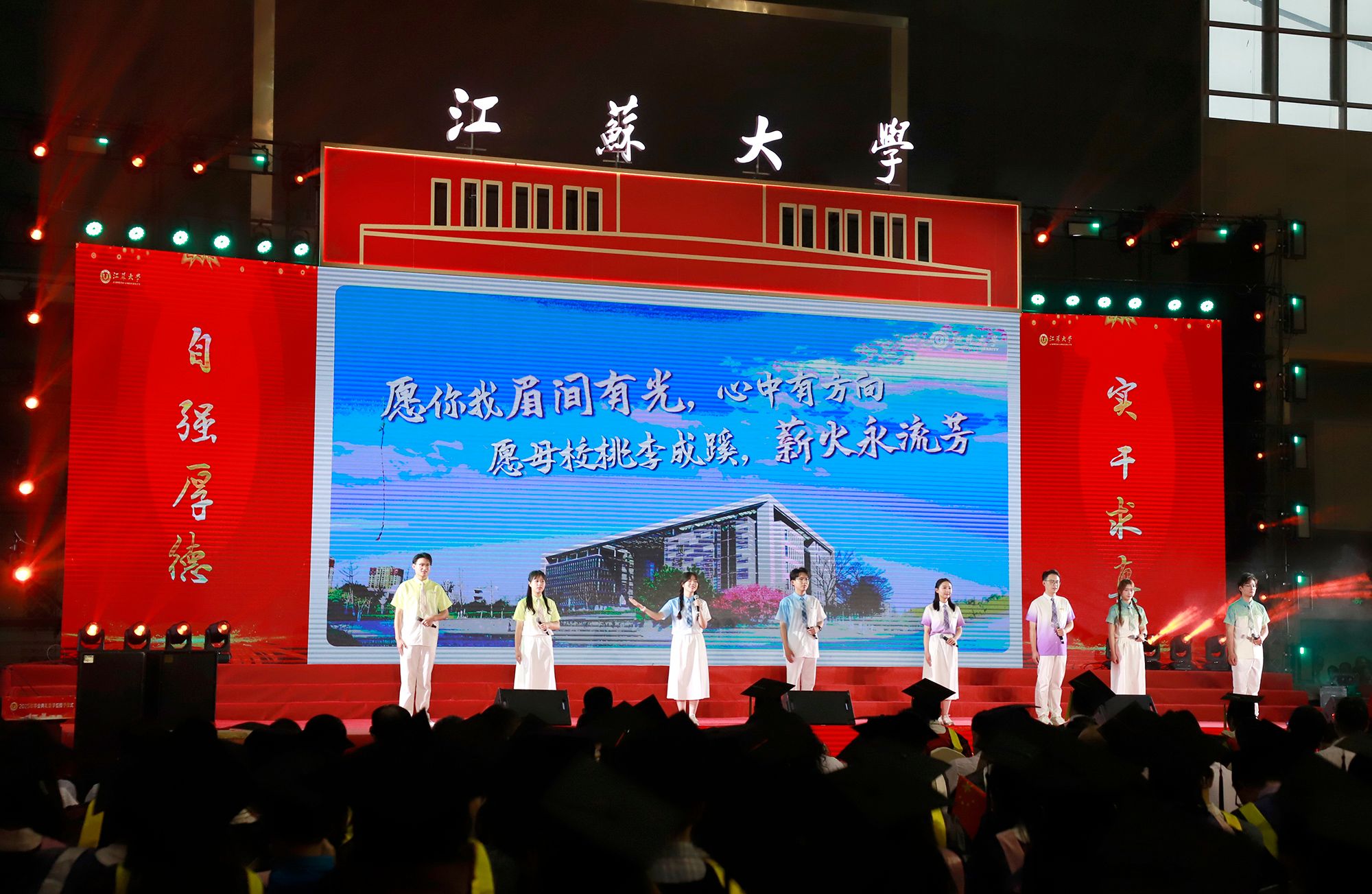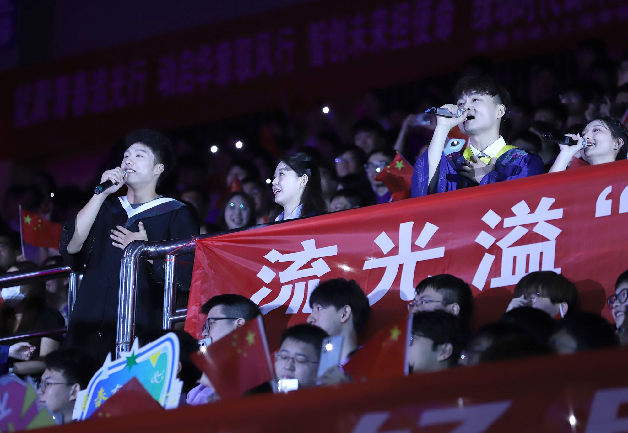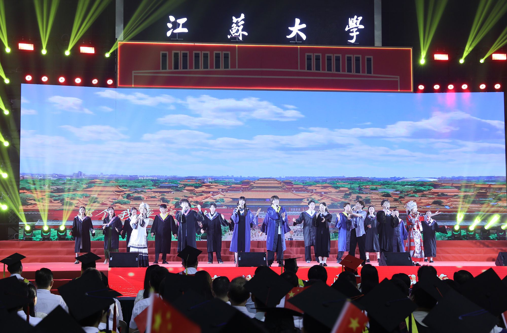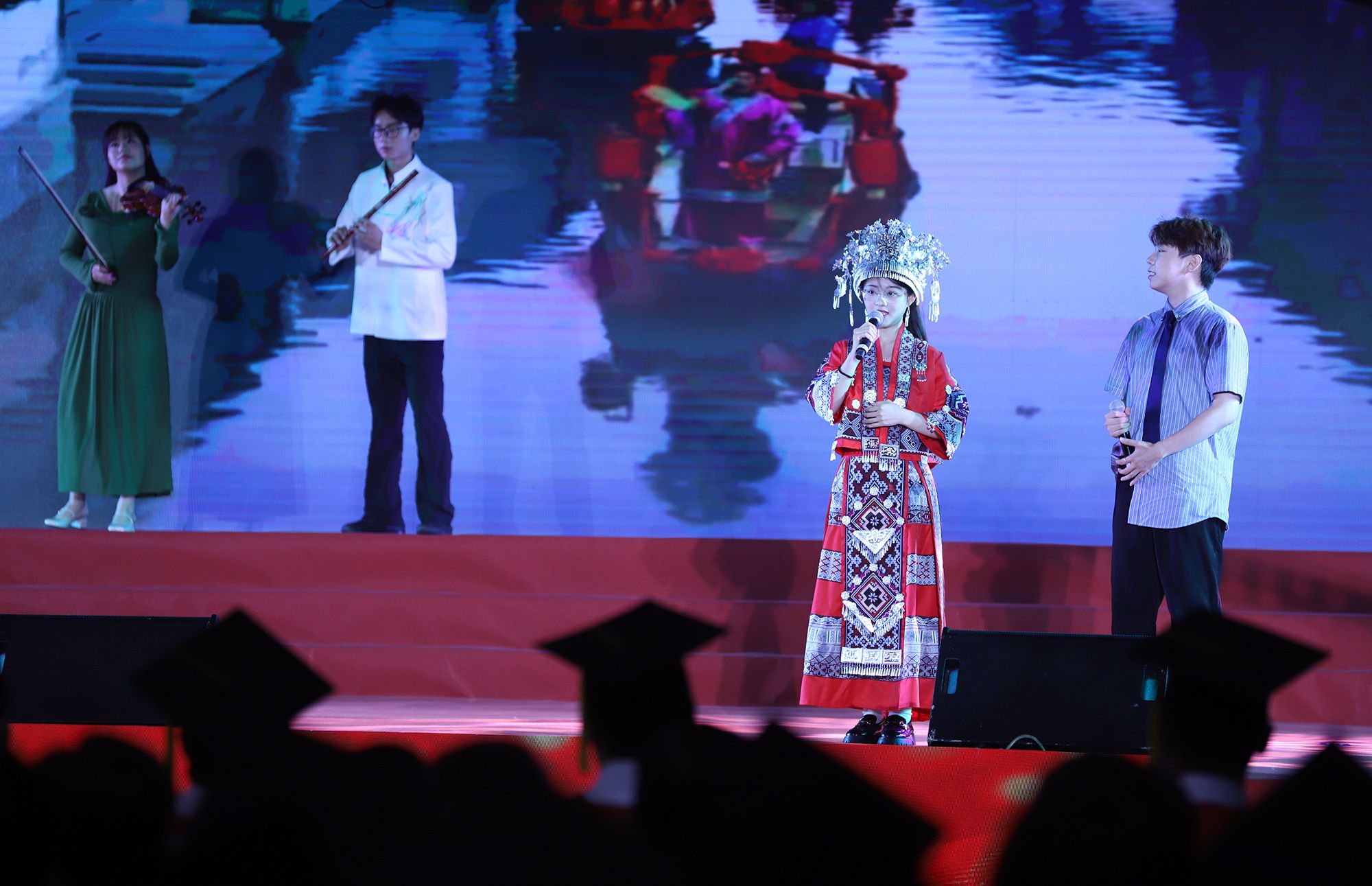 典礼前,毕业生代表演唱了《凤凰花开的路口》《第一天》《本草纲目》《大中国》等暖场歌曲。