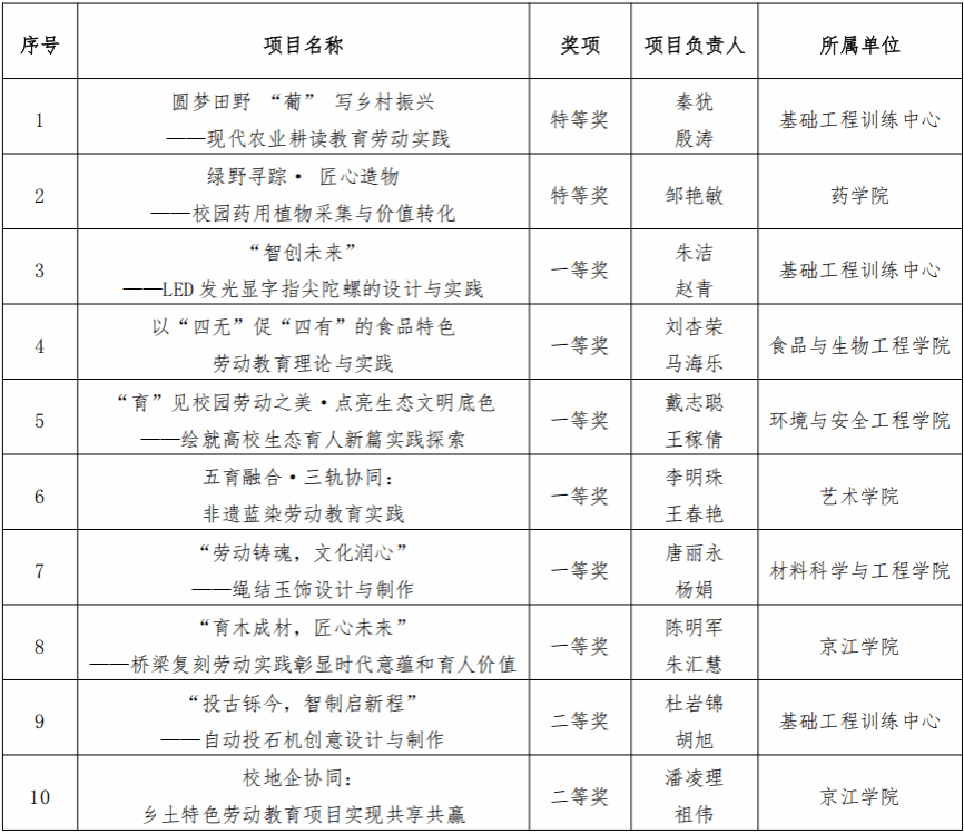 近日,2025年江苏省第二届高等学校劳动教育优秀实践项目评选结果公布。我校共有10个劳动教育实践项目获奖,其中特等奖2项、一等奖6项、二等奖2项,获奖数量位居全省高校首位,学校获优秀组织奖。