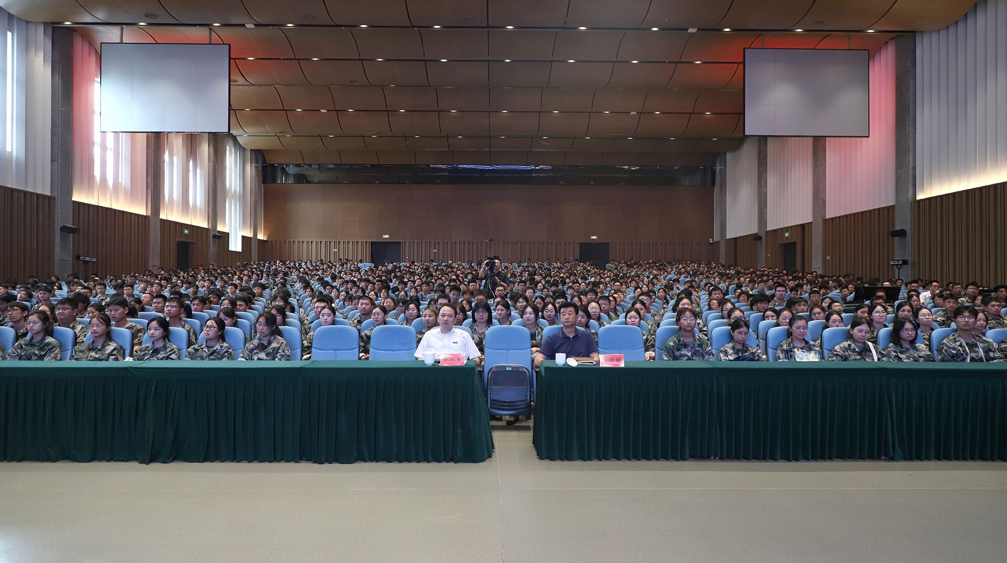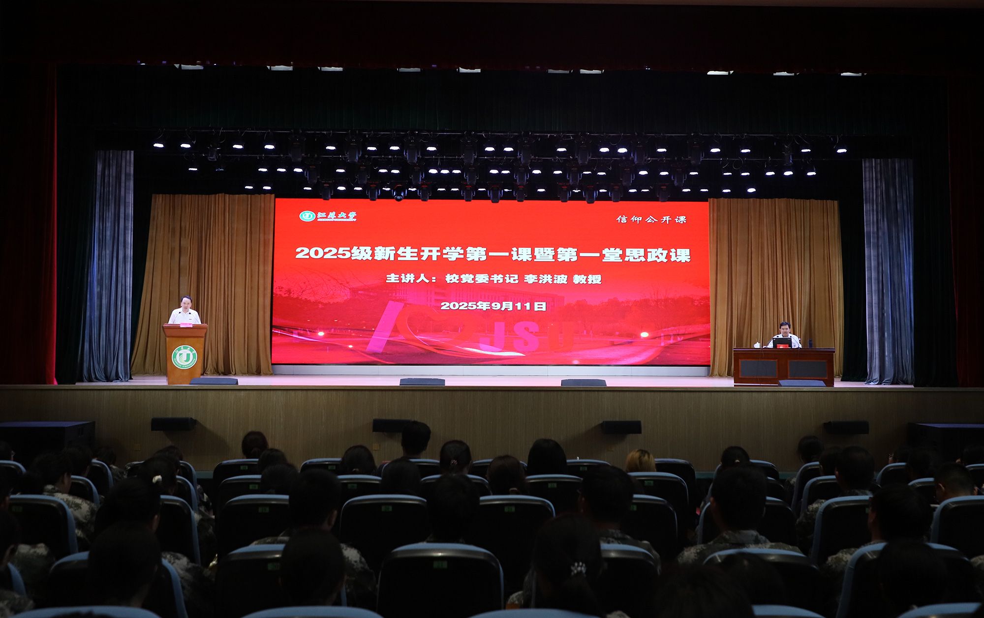 新生开学第一课采用线上线下相结合的形式讲授,部分本科新生代表和新生辅导员在大礼堂主课堂线下听课,其余本科新生及研究生新生通过学校官方视频号收看直播授课。(党委宣传部)