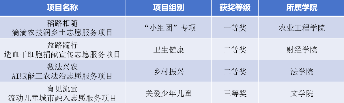 近日,由共青团江苏省委、江苏省青年志愿者协会主办的2025年江苏省高校青年志愿服务项目大赛暨高校青年志愿服务研讨活动在南京审计大学举行。我校推荐4个项目参赛,获一等奖1项、二等奖2项、三等奖1项。