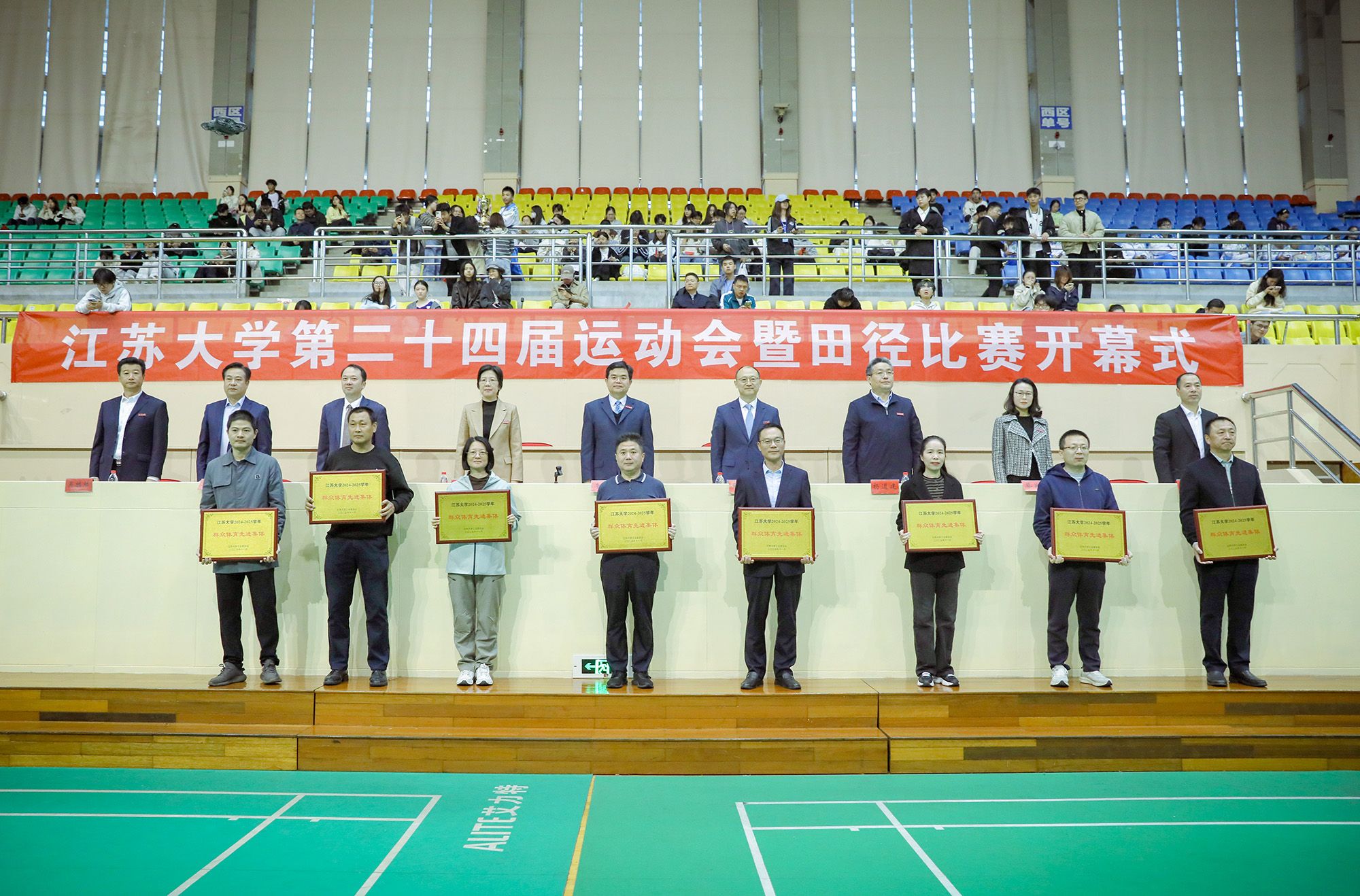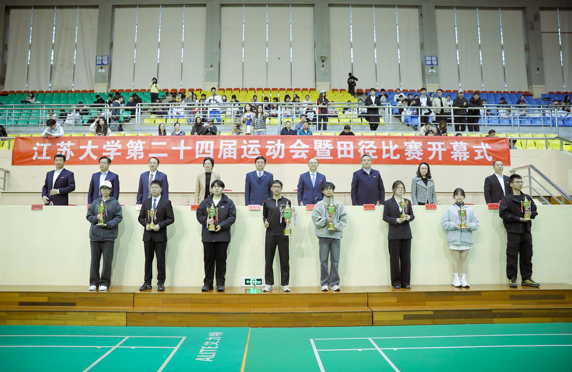 校党委副书记张济建宣读了第二十三届运动会团体总分前八名学院名单及教工群众体育先进集体表彰决定,主席台领导为受表彰单位颁奖。