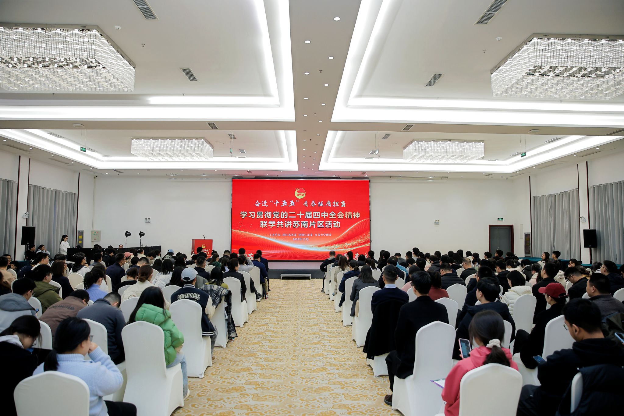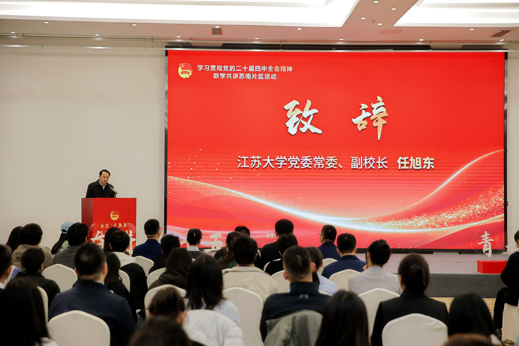 12月9日,学习贯彻党的二十届四中全会精神联学共讲苏南片区活动在镇江举办。活动由团江苏省委、团镇江市委、开云电子入口_开云(中国)共同主办。团省委副书记翟胜丞,校党委常委、副校长任旭东,团省委宣传部部长董悦、新媒体发展中心主任孙洪洋,南京、无锡、常州、苏州、镇江等5市团委分管书记、宣传部长,以及青年讲师团代表、团干部代表、青年师生代表等200余人参加活动。