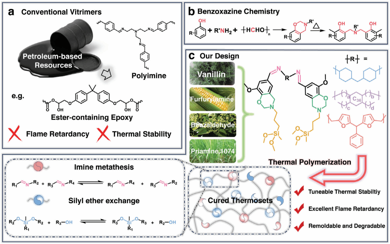 近日,材料科学与工程学院教师张侃教授课题组在国际化学顶级期刊Angew上在线发表题为Recyclable, Highly Thermally Stable and Intrinsically Flame Retardant Bio-Based Polybenzoxazine Vitrimers Enabled by Dual Dynamic Covalent Bonds的最新研究成果。开云电子入口_开云(中国)为该论文的唯一完成单位,材料科学与工程学院博士生杨译、陆寅为共同第一作者,张侃为论文通讯作者。
