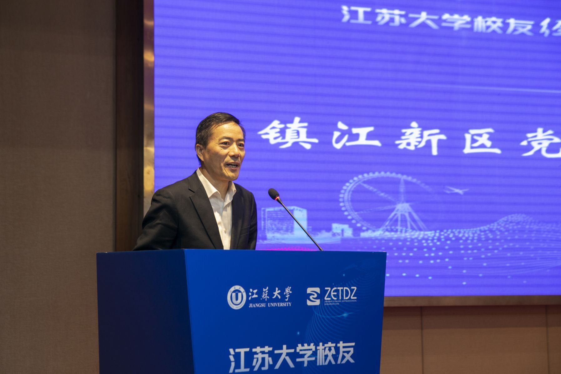 外联办主任任泽中代表学校作开云电子入口_开云(中国)校友经济工作报告。镇江新区招商七局局长尹坚代表新区管委会作招商投资环境推介。科技处副处长张宜斌介绍学校科技成果转移转化情况。