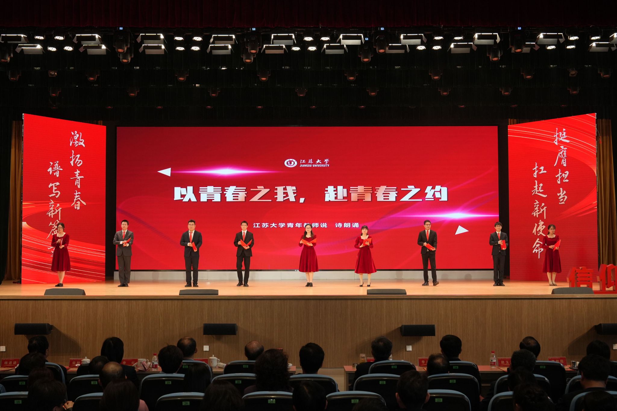 管理学院物流管理2202 团支部带来《青春底色》主题风采展示。校十佳青年教职工获奖代表带来《以青春之我,赴青春之约》朗诵。大学生艺术团带来开场舞《盛开》和朗诵《密码》。