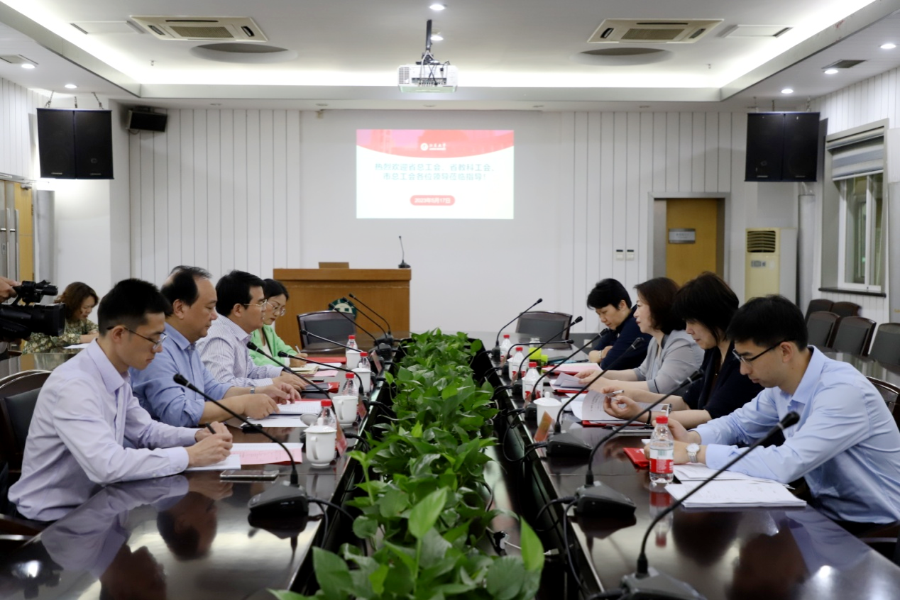 5月17日,省总工会副主席张迎春、省教育科技工会主席寇芳一行在镇江市总工会副主席解军英的陪同下来我校调研指导工作,校党委副书记李洪波、工会常务副主席沈良钧等参加会议。