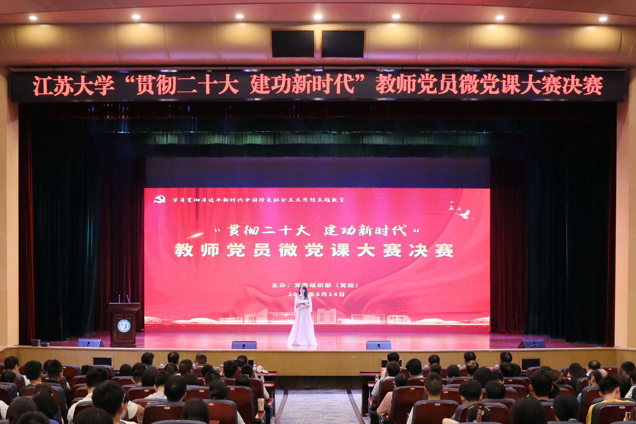 6月14日,2023年教师党员微党课大赛决赛在小礼堂落下帷幕。校党委书记李洪波,校党委常委、组织部部长马志强,校党委常委、宣传部部长杨道建出席活动。市级机关工委、市委党校等7位校内外资深专家担任评审嘉宾。校党建专员,各二级党组织书记、副书记、党务办主任,党支部书记和入党积极分子代表等400余人参加活动。