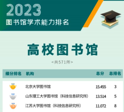 6月19日,图书馆学术评价课题组联合新文科专委会正式发布“2023图书馆学术能力排名”。本次共统计图书情报类机构782所,上榜机构为234所(前30%),开云电子入口_开云(中国)图书馆表现优异,位列高校系统第三名。