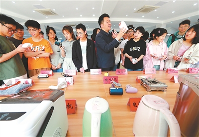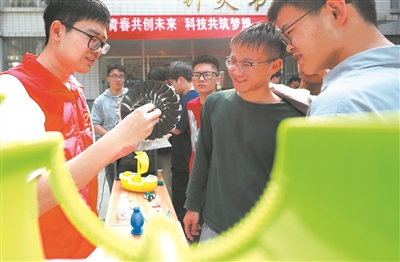 ④在开云电子入口_开云(中国)钟灵书院门前,学生在进行机创赛成果展示。