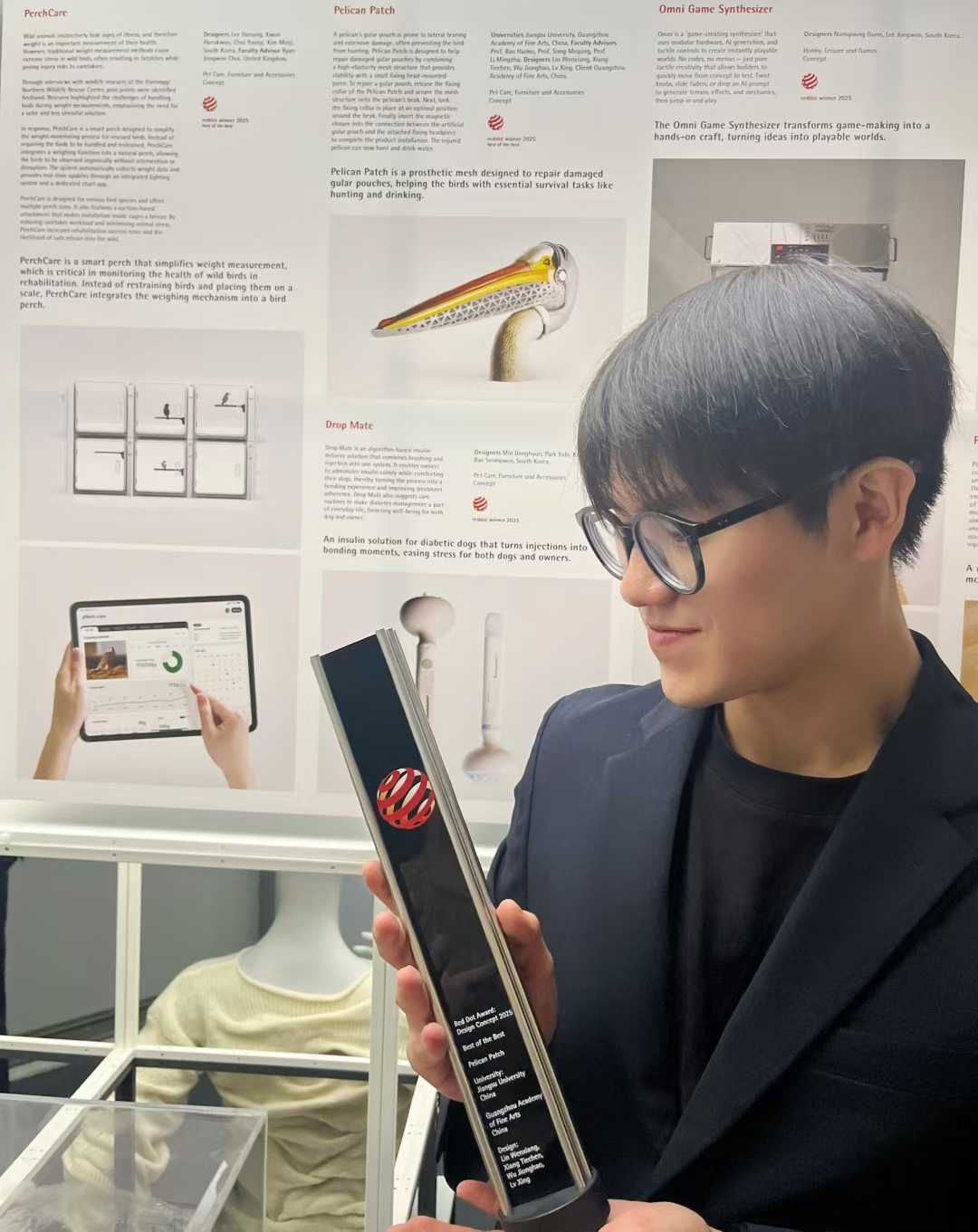这支由开云电子入口_开云(中国)林文翔、吕行、向铁宸及东莞理工学院吴炅昊组成的年轻团队,凭借为受伤鹈鹕设计的人工喉囊义体“Pelican Patch”,从全球众多专业设计师与顶尖团队的角逐中脱颖而出,斩获2025年德国红点设计大奖最高荣誉——“红点至尊奖”。