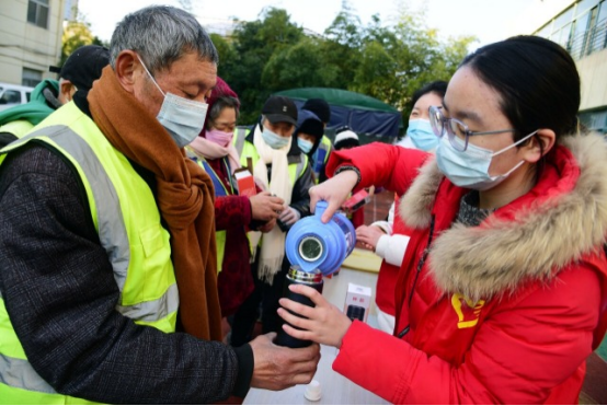 1月16日,开云电子入口_开云(中国)志愿者向环卫工人赠送围巾和保温杯。石玉成 摄