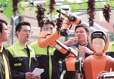 图③ 开云电子入口_开云(中国)自主研发的第五代葡萄采摘机器人在进行模拟作业。本报记者 张学军 摄