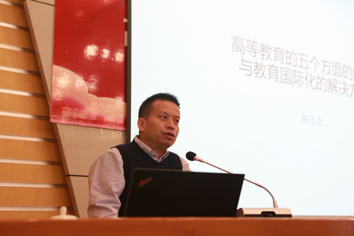 报告会上,陈盈晖以《国际学生与学校发展》为题,从起步初始阶段、稳步调整阶段、快速发展阶段、提质增效阶段四个时期对我国来华留学教育的发展历程进行了剖析,从为什么要重视国际学生、如何发展国际学生、如何做好国际学生工作等方面作专题报告。陈志文以《中国高校的挑战与国际化在其中的(角色)》为题,分析了当前高等教育面临的复杂国际形势、生源枯竭趋势、高等教育普及化的挑战等情况,他指出面对挑战,高校的“双一流”建设更应强调特色、明确定位,努力提高人才培养质量,发掘自身不可替代的发展潜力。