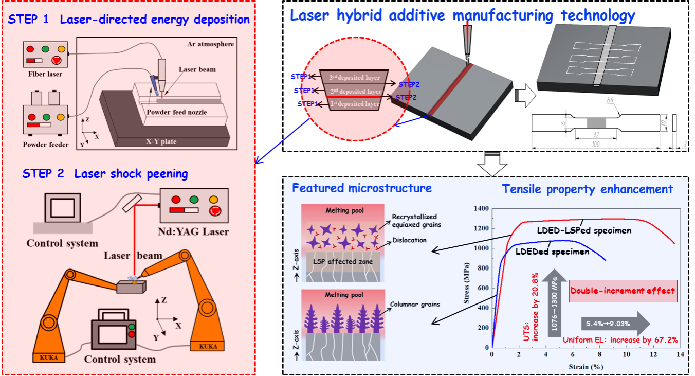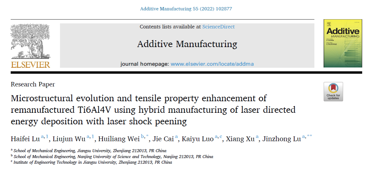 近日,经初评推荐、资格审查、专业评审、综合评审等程序,机械工程学院鲁金忠教授团队发表在《Additive Manufacturing》上的SCI高被引论文“Microstructural evolution and tensile property enhancement of remanufactured Ti6Al4V using hybrid manufacturing of laser directed energy deposition with laser shock peening(激光热力交互沉积再制造Ti6Al4V合金微观组织演变和拉伸性能强化)”入选2024年江苏省自然科学百篇优秀学术成果论文推选(开云电子入口_开云(中国)唯一入选)。青年教师卢海飞副教授为第一作者,鲁金忠和南京理工大学韦辉亮教授为共同通讯作者。该工作得到国家自然科学基金(51775250)等资助。