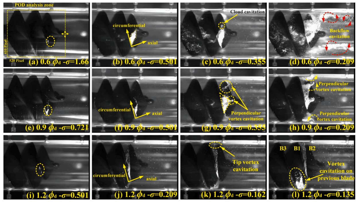 研究团队发现了涡轮泵诱导轮不同工况下的三种典型空化类型,表征了诱导轮在全工况空化行为演化规律。在(0.6-0.8)Qd工况下出现轮毂涡空化和回流涡空化;在(0.8-1.0)Qd工况下出现垂直涡空化;在(1.0-1.2)Qd工况下出现旋涡空化,同时叶顶泄漏涡空化普遍存在于所有工况。建立了瞬态压力脉动与空化动力学行为的定量关联模型,发现在空化脱落和溃灭过程小流量工况(0.6-0.8)Qd诱发大于636Hz的高频压力脉动,而大流量工况(1.0-1.2)Qd仅诱发小于322Hz的低频压力脉动。该研究工作实现了诱导轮全工况空化行为图谱化解析,揭示了空化-压力动态耦合机制,并证实小流量工况下空化溃灭是高频压力脉动的核心激励源,为航天涡轮泵空化失稳机理预测与抑制提供了理论基础。